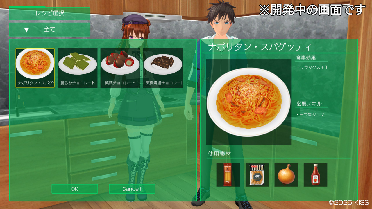 料理にはレシピ・スキル・食材が必要となり、主人公が調理するだけでなく、ヒロインが作る場合やふたりで一緒に作る場合も選択可能です。